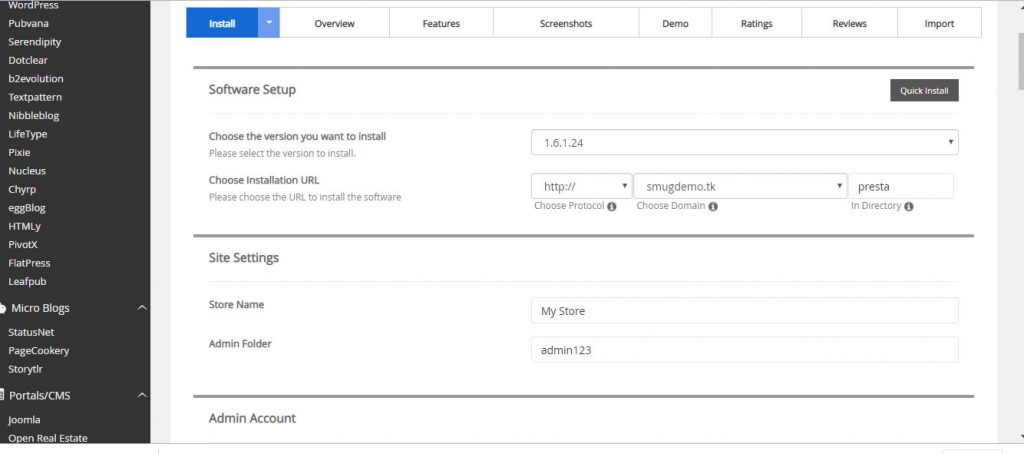 Choose Installation URL – Choose the domain you want to install PrestaShop onto, you can also install it into a sub-folder using adding it to the third box.