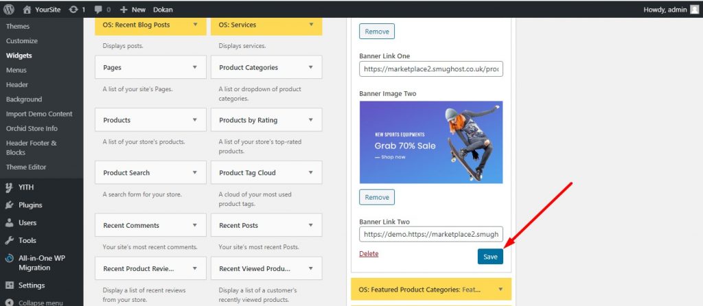 8. We are going to edit the “Frontpage Widget Area”, so click the arrow next to it and then click the arrow next to “OS: Banner”.