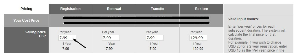 6. Modify the prices: Now simply enter the price you want to change that domain name to and then click the blue submit button at the bottom of the page.