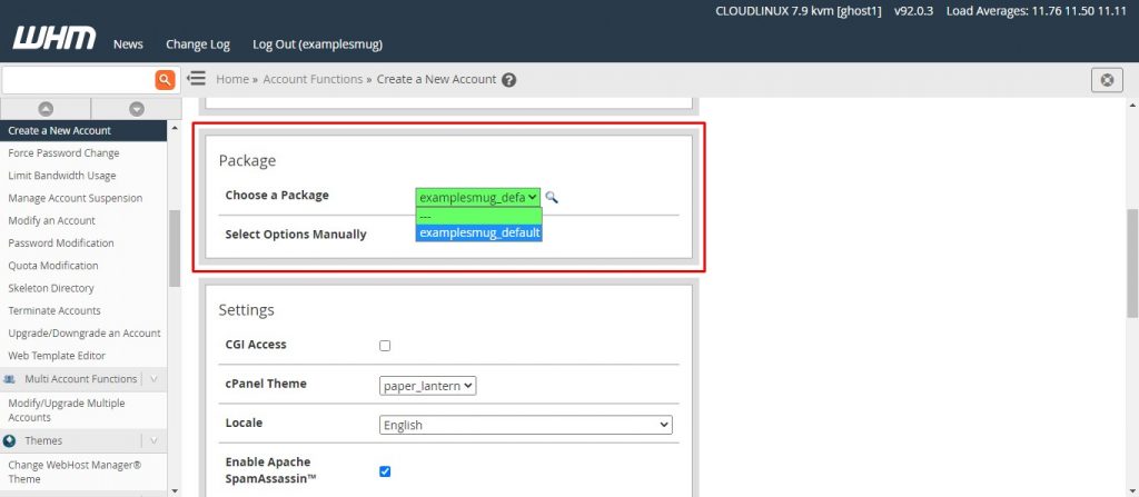 2. Find and Click “Create a New Account” under the “Account Functions” tab on the menu. You can also use the same option on the home of WHM.